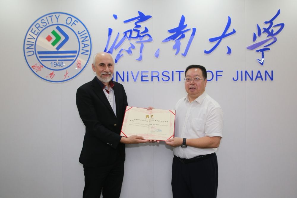 院士亚历山大•苏沃洛夫一行访问济南大学。校长刘宗明会见来访客人,并为亚历山大•苏沃洛夫院士颁发荣誉教授聘书。学校人力资源处、科技处、国际合作与交流处、太阳城娱乐城