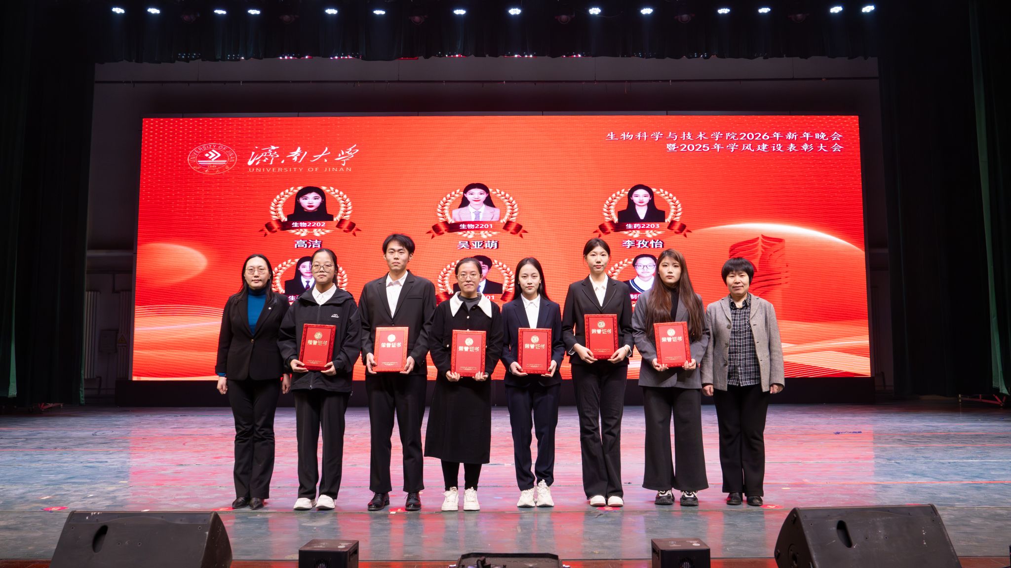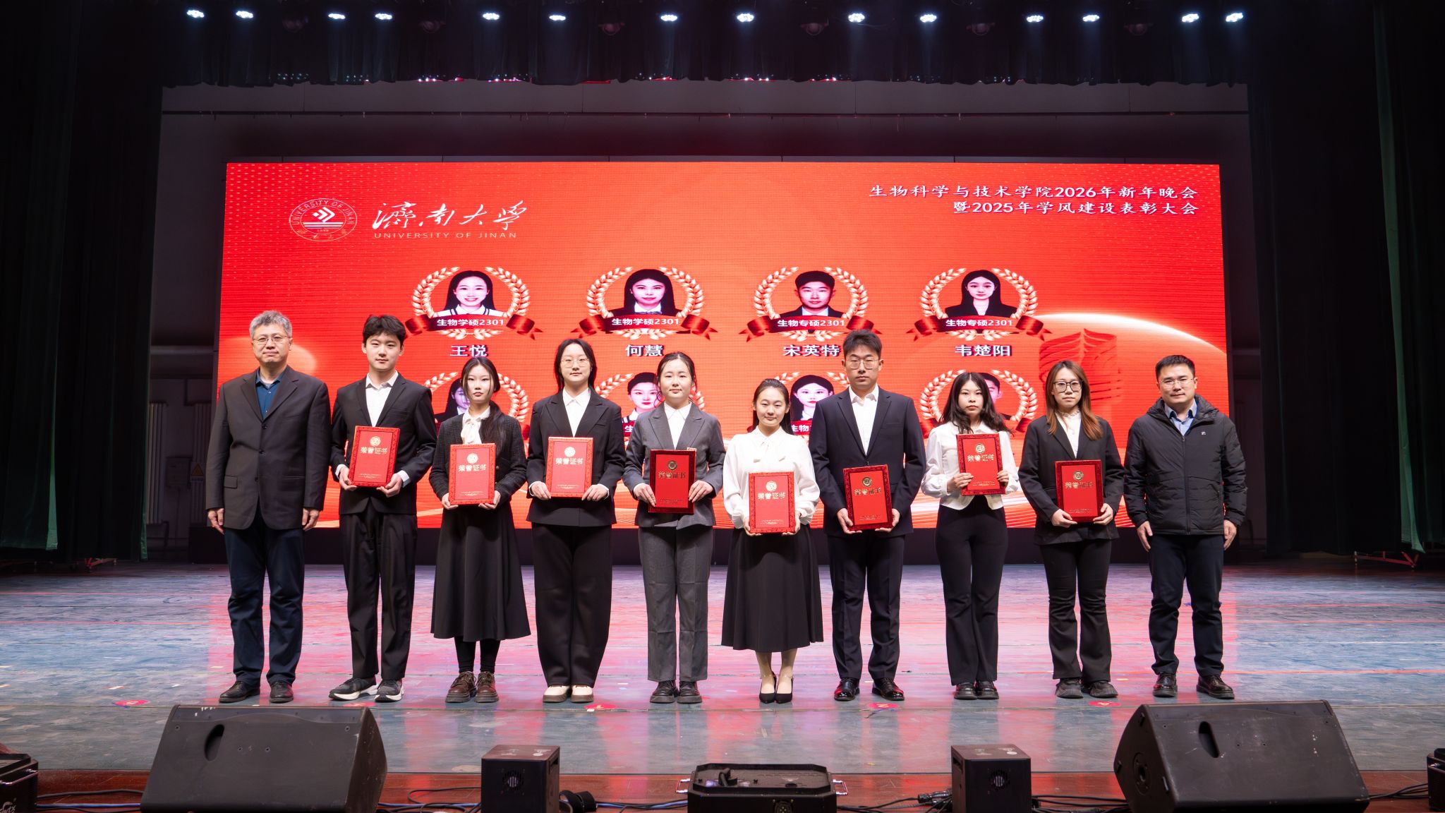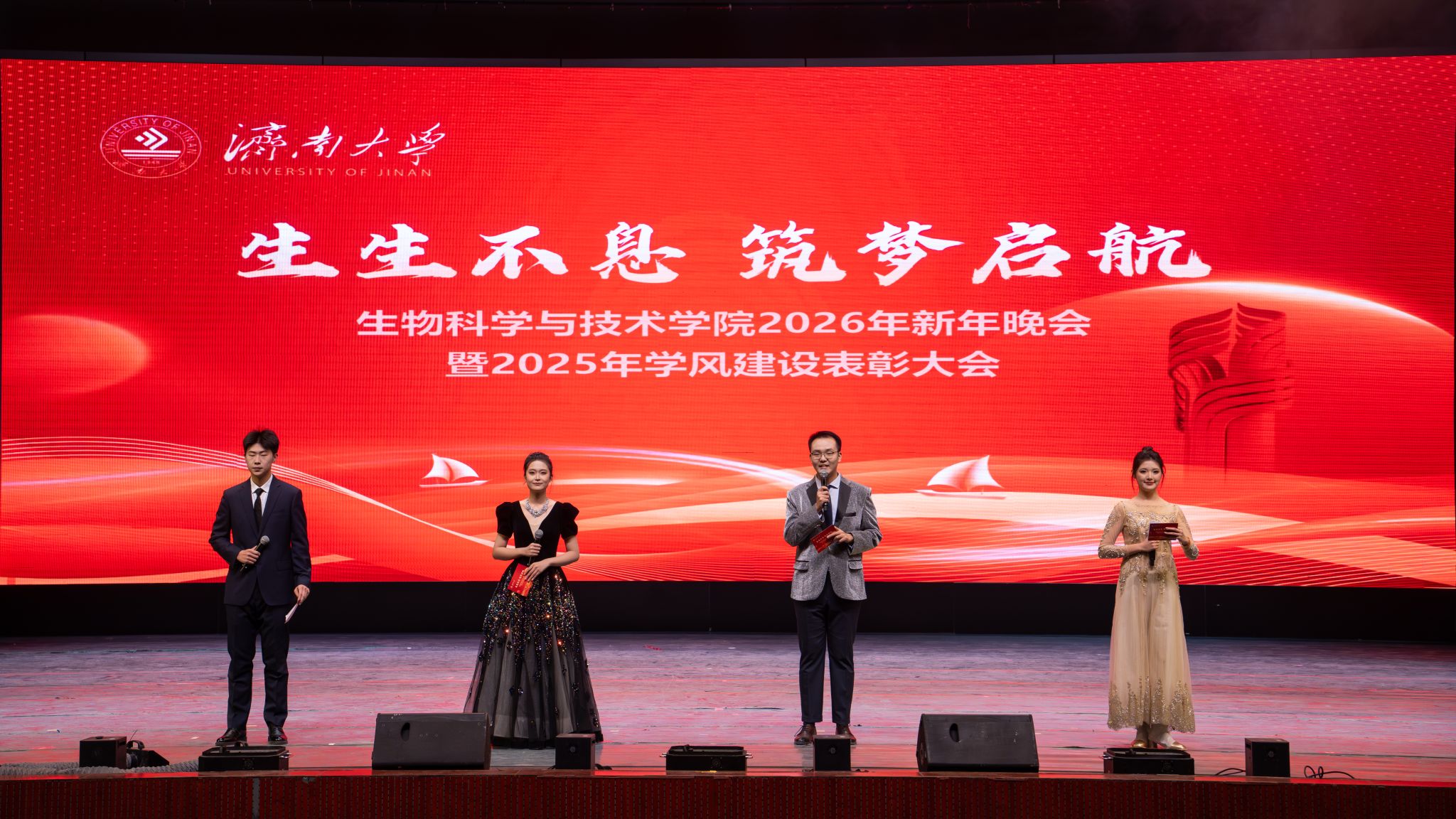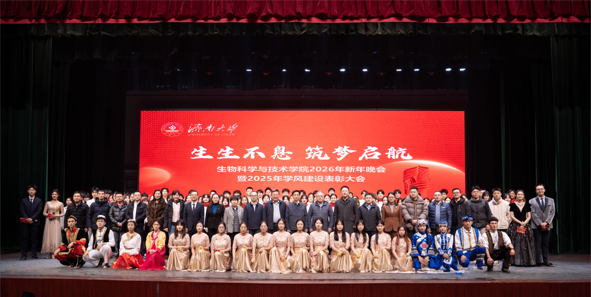 发展的崭新篇章。随后,学校领导、职能部门、校友代表先后为“突出贡献奖”“科研创新奖”“教学卓越奖”“科创育人奖”的获奖教师代表,以及优秀学生代表颁奖。表彰环节后,精彩纷呈的文艺演出将晚会推向高潮。整场晚会分为“星光汇聚,生科闪耀”“激扬青春,携手同行”“砥砺奋进,筑梦启航”三大篇章。