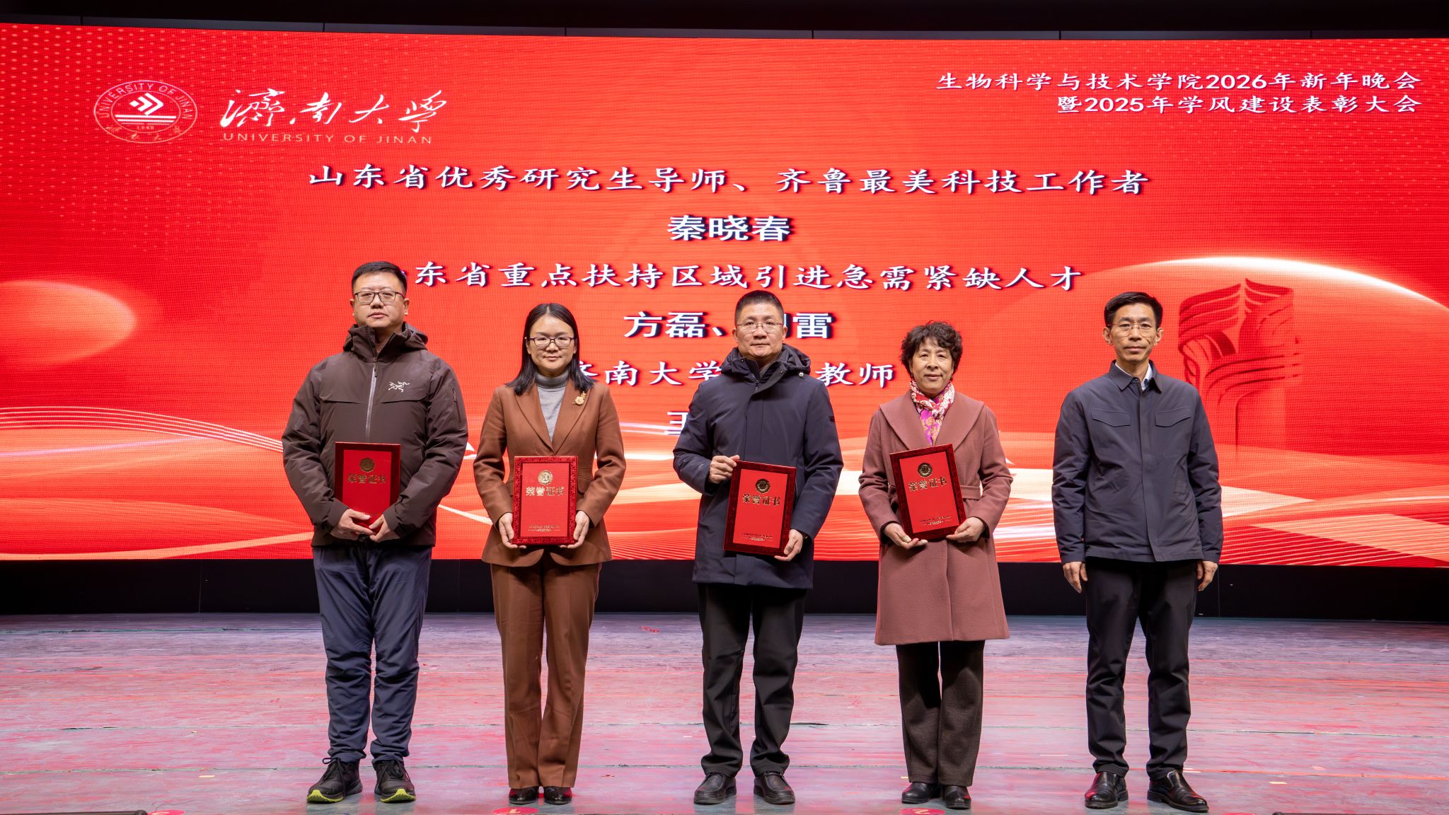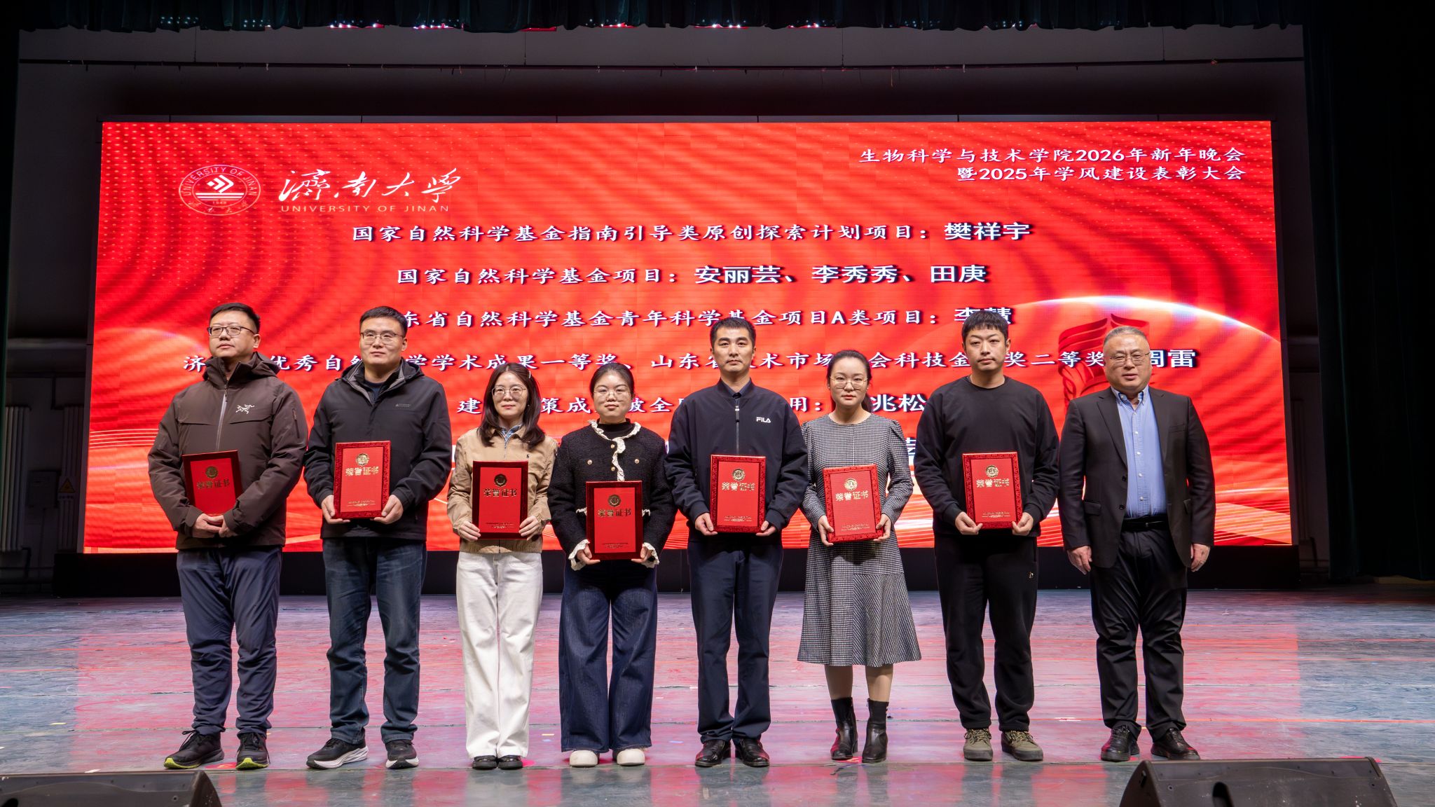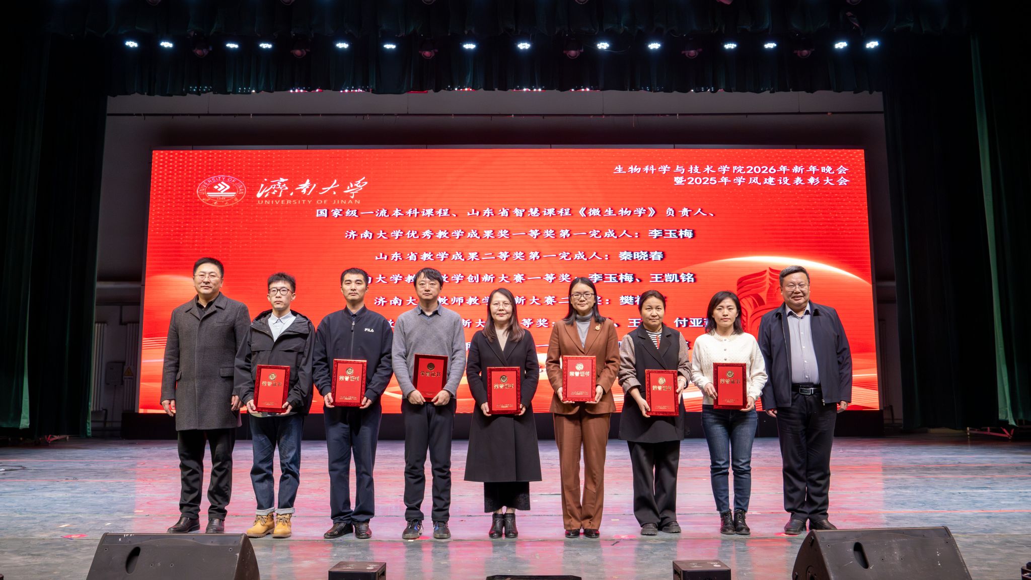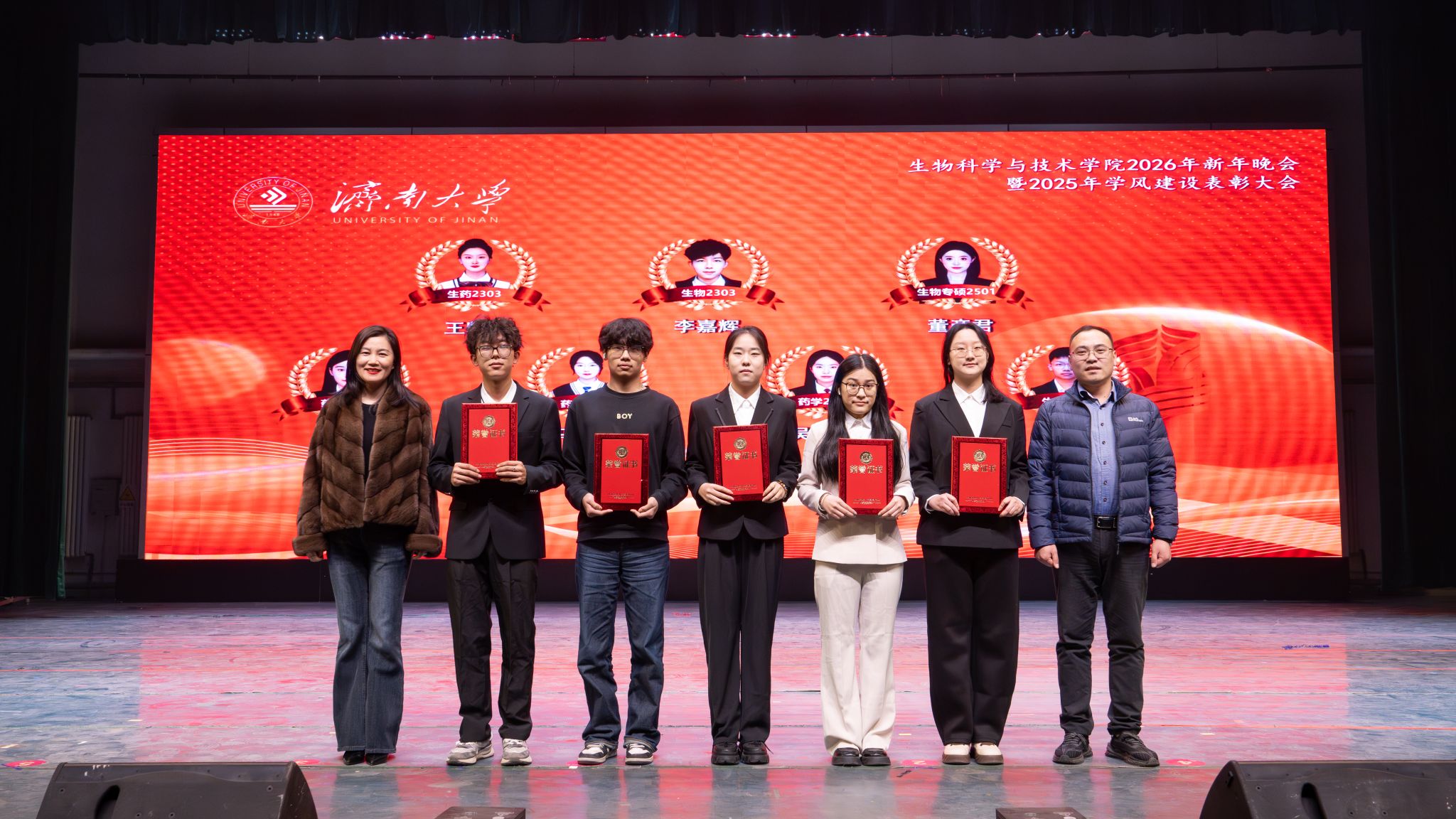 发展的崭新篇章。随后,学校领导、职能部门、校友代表先后为“突出贡献奖”“科研创新奖”“教学卓越奖”“科创育人奖”的获奖教师代表,以及优秀学生代表颁奖。表彰环节后,精彩纷呈的文艺演出将晚会推向高潮。整场晚会分为“星光汇聚,生科闪耀”“激扬青春,携手同行”“砥砺奋进,筑梦启航”三大篇章。