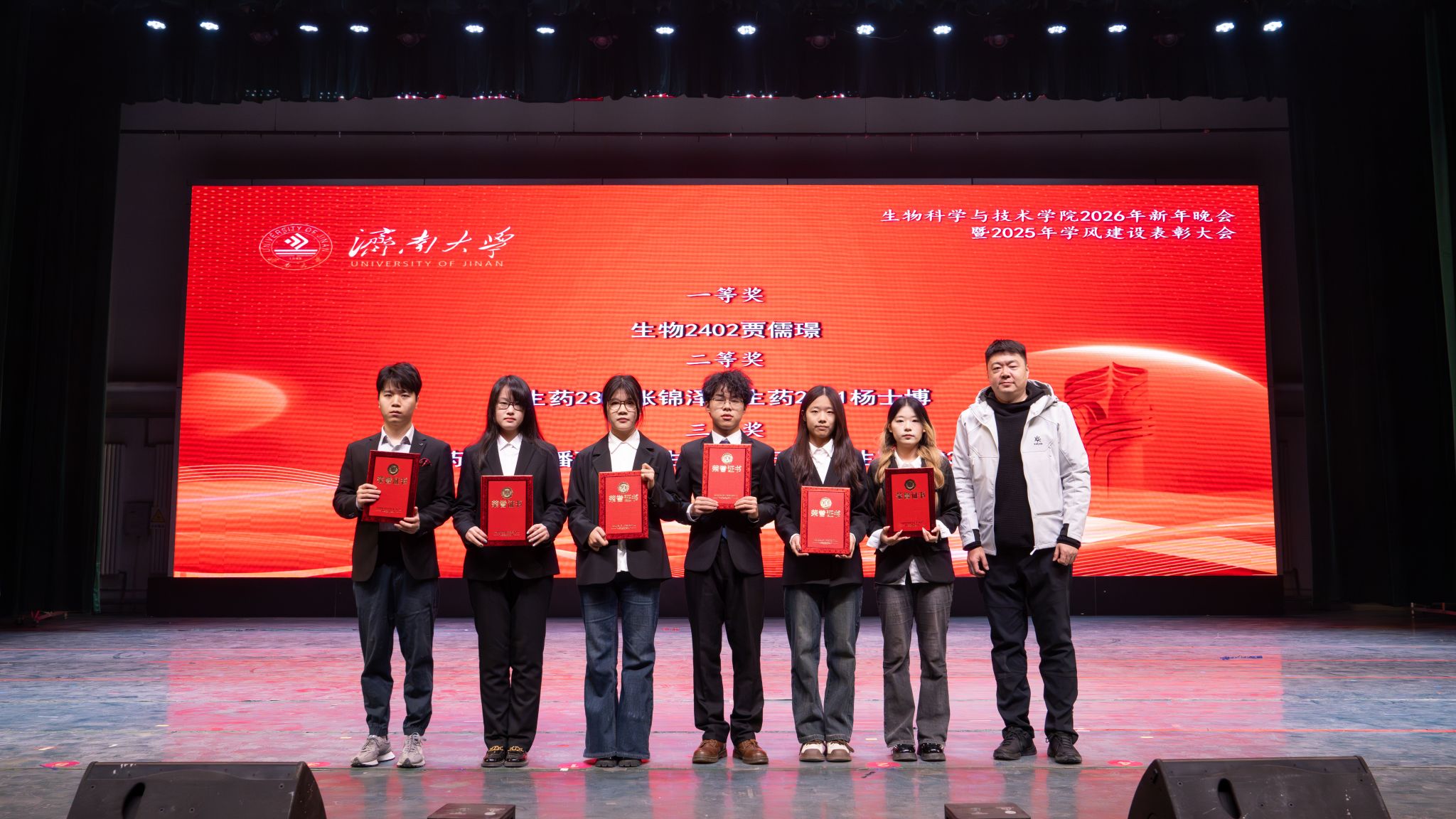 “生生不息 筑梦启航”2026年新年晚会暨2025年学风建设表彰大会在璀璨华光与热烈掌声中隆重举行。学校党委常委、副校长李强,党委常委、副校长黄加栋,党委常委、统战部部长徐庆国,党委常委、宣传部部长卢旺,党委学生工作部(处)、党委保卫部、党委教师工作部、教务处、党委研究生工作部、合作发展处、团委(创新创业太阳城娱乐城